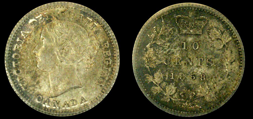 1858 10¢ ICCS MS64 Full lustre and brownish gold tone. Scarce!