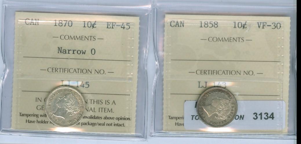 1858 10¢ ICCS VF-30; 1870, Narrow O. ICCS EF-45. Lot of two (2) coins, both lightly toned.