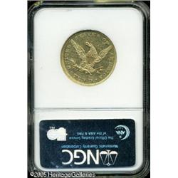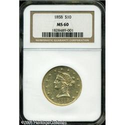 <B>1858 $10 MS60 NGC.</B></I> This is a classic rarity within the Liberty Eagle series. Just 2,521 examples were coined, the 15th lowest mintage of the entire design from 1838 to 1907, and the fifth lowest of the No Motto issue. Mint State examples of this issue are extremely rare. In our own Auction Archives, we have listings for only 23 examples of this date in all grades, and most of those represent repeated appearances of a small number of coins. We have only offered three Mint State examples, one which is offered again in this sale. Walter Breen suggested that only about 12 to 15 examples of this issue survive today, and, while we feel that total may be a little low, there are realistically not more than about 25 or 30 examples surviving, to the best of our knowledge. This is a pleasing example with light yellow surfaces and slightly reflective fields. Both sides have light to moderate abrasions that are consistent with the grade. A few small marks along the edge of Liberty's neck, and a few others scattered about the fields on both sides should prove to be adequate pedigree identifiers. Population: 2 in 60, 2 finer (1/05). Lot:8755