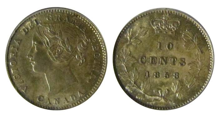 1858 10¢ PCGS MS64. Lustrous with darkish tones. Nice.