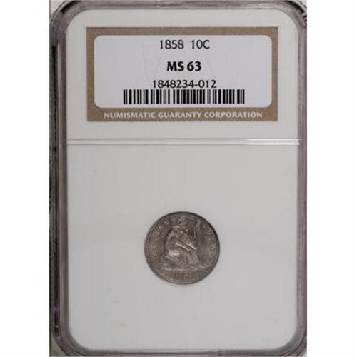 <B>1858 10C MS63 NGC.</B></I> . NGC Census: (21/66). PCGS Population (18/37). Mintage: 1,500,000. Numismedia Wsl. Price for NGC/PCGS coin in MS63: $433. (#4616)<BR><BR><B>Coin Engraver:</B> Christian Gobrecht<BR><BR><b>Shipping:</b> Coins & Currency (<a target="_blank" href="http://www.heritageauctions.com/common/shipping.php">view shipping information</a>)