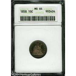 1858 10C MS64 ANACS. Cobalt-blue and rose-lavender <B>1858 10C MS64 ANACS.</B></I> Cobalt-blue and rose-lavender patination dances over lustrous surfaces that display well struck design features. <BR><BR><B>Important notice:</B> Heritage usually auctions material at the rate of 200-250 lots per hour. On some occasions eBay Live bid software or the Internet may not be able to keep up with the pace of the auction. We recommend placing a realistic absentee bid now as insurance to avoid disappointment. Occasionally the auctioneer may eliminate or reject an eBay Live bid, and the auctioneer may also reopen a lot after the close of the eBay live bidding (usually because we missed an audience bid), and may reject your bid even if it shows you as the winning bidder. By bidding via eBay Live, you agree that Heritage may award the lot to another bidder at its sole discretion under the circumstances described above or any other reasonable circumstances. Since eBay bids are not shown to us until we open the lot on the floor, we treat those bids just like floor bids. In most cases the floor responds before the eBay bid is presented to us, due to Internet lag time, so for consistency we have made it a policy that floor bids are always considered first over tie eBay live bids. Also please note that all Heritage lots purchased through eBay Live carry a 20% Buyer's Premium. Please make sure you read the Terms and Conditions before you bid. This lot is being auctioned in conjunction with a live floor auction by Heritage Galleries & Auctioneers. All final auction and invoice information will be supplied by Heritage Galleries & Auctioneers, and all other information should be considered preliminary. Lot:5714