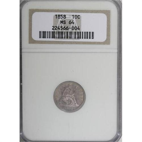 <B>1858 10C MS64 NGC.</B></I> This is a truly lovely Seated dime, with smooth, satiny surfaces and well struck design elements. Light lilac and gold toning increases the eye appeal of this unmarked example. Like any Stars Obverse dime, this is a scarce issue in Gem condition. Census: 41 in 64, 25 finer (10/07). <BR><BR><B>Coin Engraver:</B> Christian Gobrecht<BR><BR><b>Shipping:</b> Coins & Currency (<a target="_blank" href="http://www.heritageauctions.com/common/shipping.php">view shipping information</a>)