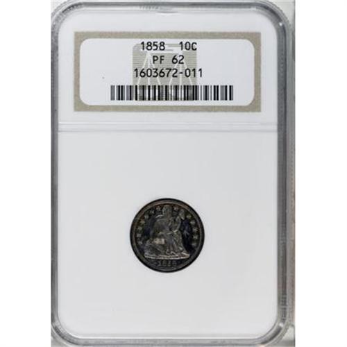 <B>1858 10C PR62 NGC.</B></I> Whispers of cobalt-blue and light tan make occasional visits to the sharply struck, silvery surfaces of this PR62 dime. A few minute handling marks define the grade.<BR><BR><B>Coin Engraver:</B> Christian Gobrecht<BR><BR><b>Shipping:</b> Coins & Currency (<a target="_blank" href="http://www.heritageauctions.com/common/shipping.php">view shipping information</a>)