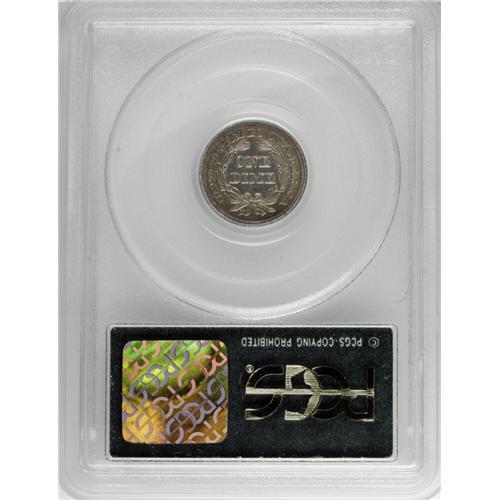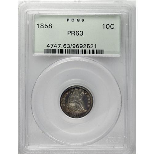 <B>1858 10C PR63 PCGS.</B></I> Nicely mirrored with tinges of blue and coppery-gold peripheral toning. Records of early proof production are sketchy at best and today's <I>Guide Book</B></I> mintage of 300+ is based more on guesswork from the number of survivors than anything else. Important as a representative of the Stars Obverse type. Population: 20 in 63, 33 finer (11/06).<BR><BR><b>Shipping:</b> Coin/Currency (<a target="_blank" href="http://www.heritageauctions.com/common/shipping.php">view shipping information</a>)