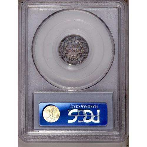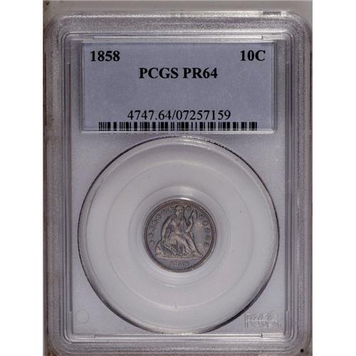<B>1858<10C> PR64 PCGS.</B></I> 1858 was the first year that proof dimes were struck in any quantity for collectors. The actual number produced is unknown. However, 1858 proofs are unquestionably more elusive than later dates. Only 24 pieces have been certified by PCGS in PR64 with a mere nine coins finer (1/06). This is a deeply reflective proof striking that is overlaid with gray and cobalt-blue toning with lighter accents over the highpoints of the design.