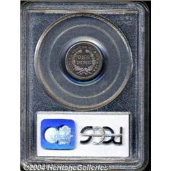 <B>1858<10C> PR65 PCGS.</B></I> Breen, in his <I>Complete Encyclopedia of U.S. and Colonial Coins,</B></I> states that about 80 Liberty Seated dime proofs were made in this year. This example has deep gunmetal blue toning around the rims, particularly on the obverse, surrounding magenta coloration at the center. The strike detail is razor sharp throughout, further enhancing the eye appeal of this marvelous coin. Significant abrasions appear to be lacking on the well preserved surfaces.<BR><I>Ex: Lester Merkin Sale (9/67), lot 218, where it realized $325.</B></I> <BR><BR><B>Important notice:</B> Heritage usually auctions material at the rate of 200-250 lots per hour. On some occasions eBay Live bid software or the Internet may not be able to keep up with the pace of the auction. We recommend placing a realistic absentee bid now as insurance to avoid disappointment. Occasionally the auctioneer may eliminate or reject an eBay Live bid, and the auctioneer may also reopen a lot after the close of the eBay live bidding (usually because we missed an audience bid), and may reject your bid even if it shows you as the winning bidder. By bidding via eBay Live, you agree that Heritage may award the lot to another bidder at its sole discretion under the circumstances described above or any other reasonable circumstances. Since eBay bids are not shown to us until we open the lot on the floor, we treat those bids just like floor bids. In most cases the floor responds before the eBay bid is presented to us, due to Internet lag time, so for consistency we have made it a policy that floor bids are always considered first over tie eBay live bids. Also please note that all Heritage lots purchased through eBay Live carry a 20% Buyer's Premium. Please make sure you read the Terms and Conditions before you bid.