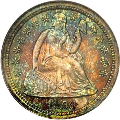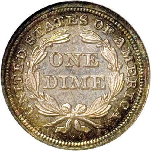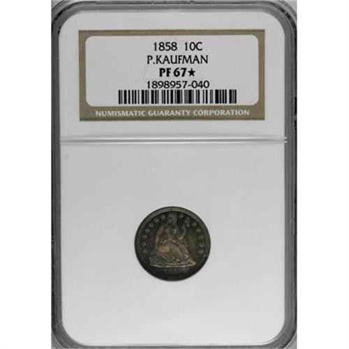 <B>1858 10C Dime PR67<img border='0' src='http://www.heritagecoins.com/images/star.gif' width=10 height=10> NGC.</B></I> Ex: P. Kaufman. Assigned the important <B> S</B></I> designation, the Kaufman coin is the single finest proof 1858 dime certified by NGC, and probably the finest existing specimen of the date. <BR> The proof silver coins dated 1858 are not particularly rare with at least 100 of each known today. From 1856 to 1859, population data shows a dramatic annual increase. For dimes, the total NGC census of certified pieces is reported as: 1856 (23), 1857 (34), 1858 (64), and 1859 (182). If a direct link between proof mintage and population could be established, then accurate estimates of earlier proof production could be determined.<BR> The date is slightly right of center with the shield point entirely left of the 1 and the skirt pendant centered over the 5. The final 8 is low and leans to the right. The obverse is lapped with a polished area between Liberty's right facing elbow and body. A short diagonal die line slants up to the right from the left inner corner of the M to a border dentil.<BR> A nearly perfect proof with sharp details, strong cameo contrast, and vibrant toning, this piece has exceptional aesthetic appeal. The obverse has virtually identical toning to the 1858 half dime while the reverse is light gray with peripheral iridescence. Census: 1 in 67 , 0 finer (6/07).<I><BR>From The Phil Kaufman Collection of Early Proof Sets, Part One.</B></I> (#4747)<BR><BR><BR><B>Coin Engraver:</B> Christian Gobrecht<BR><BR><b>Shipping:</b> Coins & Currency (<a target="_blank" href="http://www.heritageauctions.com/common/shipping.php">view shipping information</a>\)