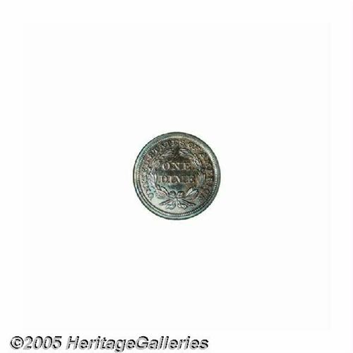 <B>1858<10C> Seated Dime PR65 NGC.</B></I> Electric-blue, gold, and lavender colors alternate across this vividly toned and exquisitely struck Gem. A well preserved representative of this scarce proof type. The legend UNITED STATES OF AMERICA was moved to the obverse in 1860, which leaves the low mintage 1858 and the 1859 to satisfy proof type collectors. Population: 14 in 65, 9 finer (6/05).