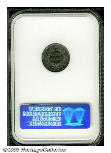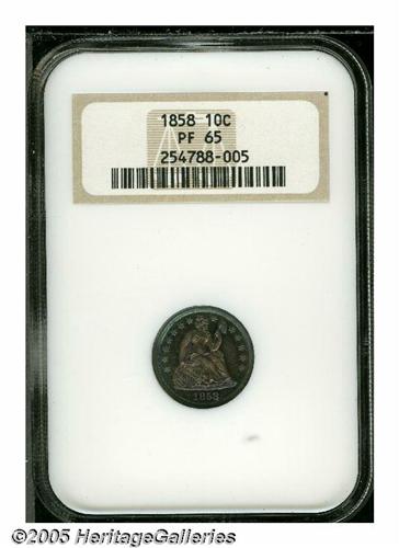 1858 10C Seated Dime PR65 NGC. Electric-blue, gol
