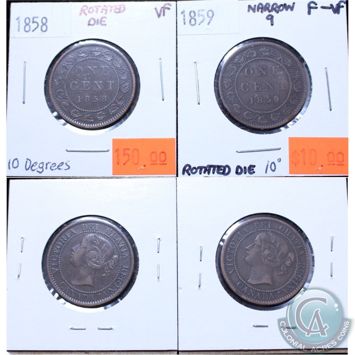 1858 & 1859 Canada 1-cent with Rotated Dies 10 Degrees