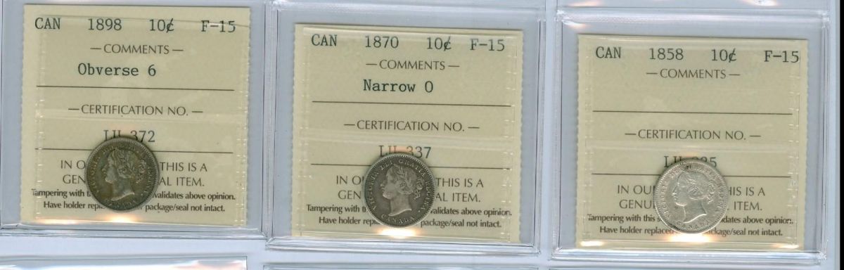 1858, 1870 Narrow, 1898 Obv.6 Lot of 3 ICCS graded 10¢ coin