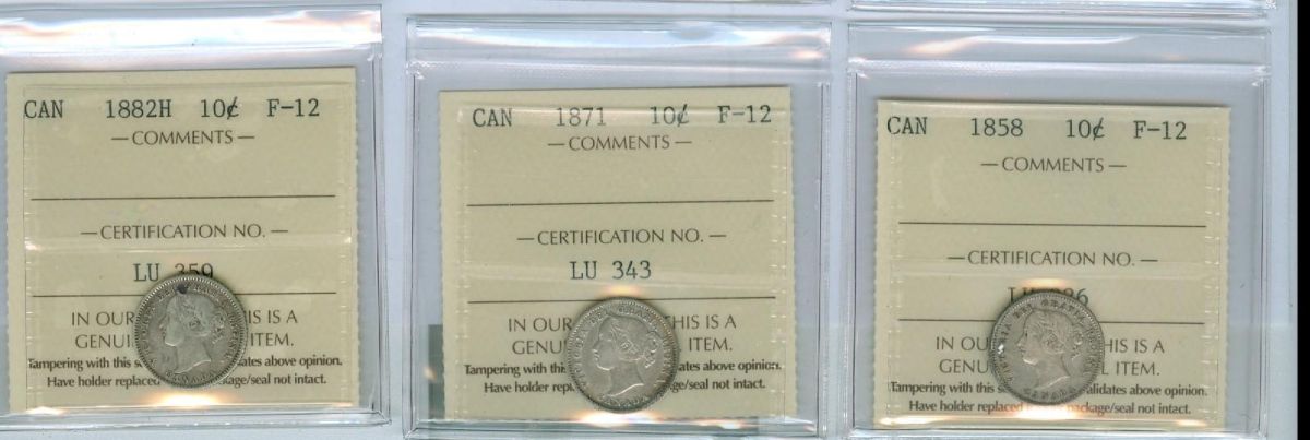 1858, 1871 and 1882H Lot of 3 ICCS graded 10¢ coins, all F12.