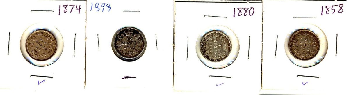 1858, 1874H, 1880 & 1898 10¢. Lot of 4 coins VG+ to VF+.