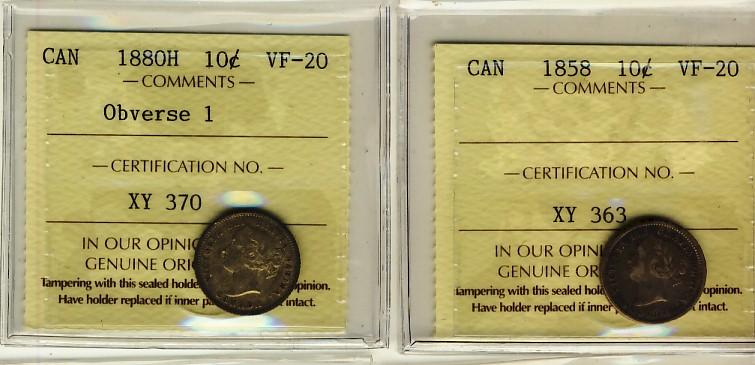 1858 & 1880H Obv 1 10¢ ICCS VF20. Lot of 2 coins.