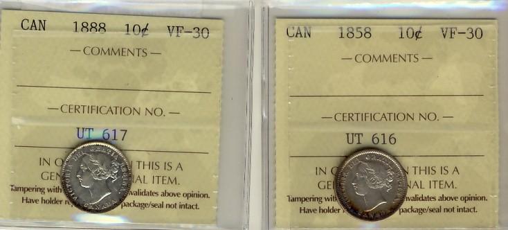 1858 & 1888 10¢ ICCS VF30. Lot of 2 coins.