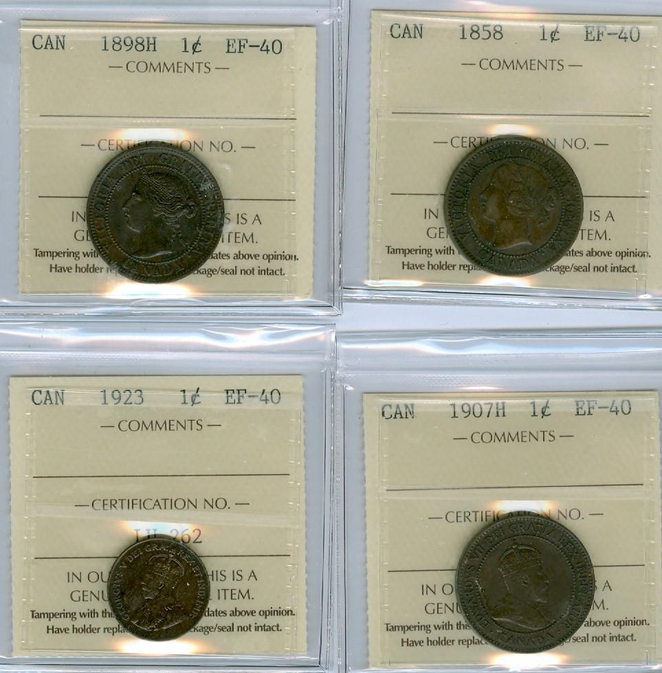 1858, 1898H, 1907H and 1923. Lot of 4 ICCS graded 1¢ coins, all EF40.