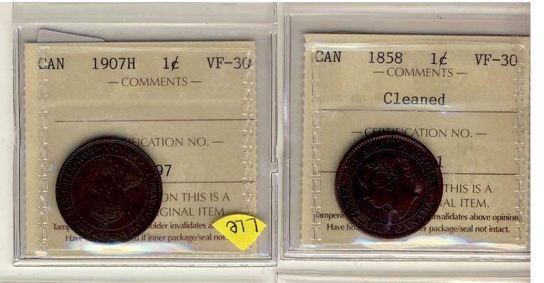 1858 & 1907H 1¢ ICCS VF30. Lot of 2 coins with the 1858 designated Cleaned.