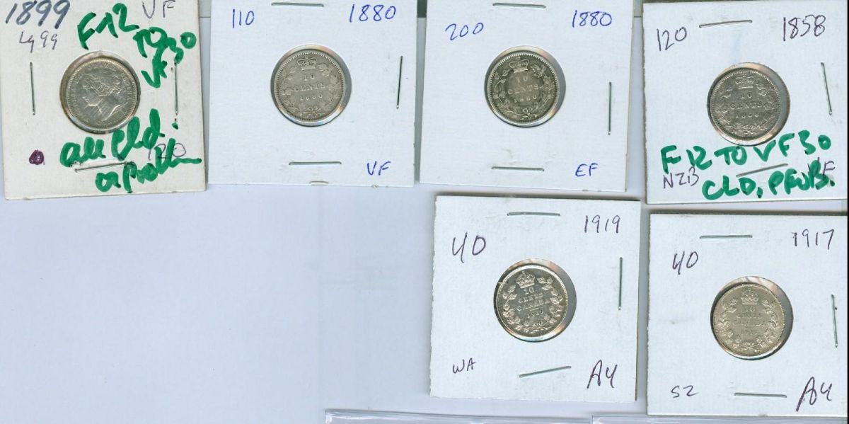 1858-1919 10¢. Lot of 6 coins including 1858, 1880H (2), 1899 Lg, 1917 and 1919. F12 to VF30. With problems. Should be viewed.