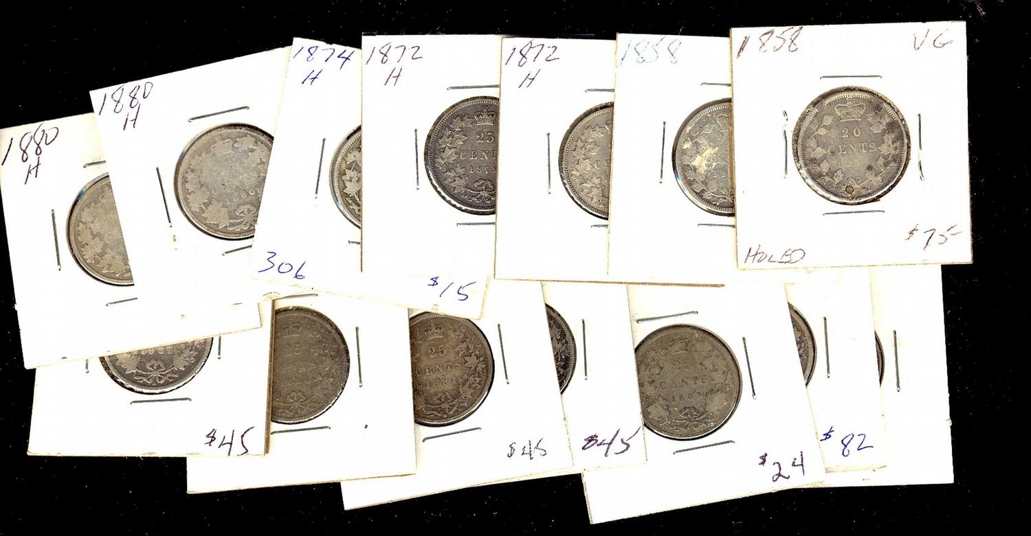 1858-1946 25¢. Lot of 38 pcs includes 1858(2), 1872H(2), 1874H, 1880H(2), 1881H(3), 1882H, 1883H, 1