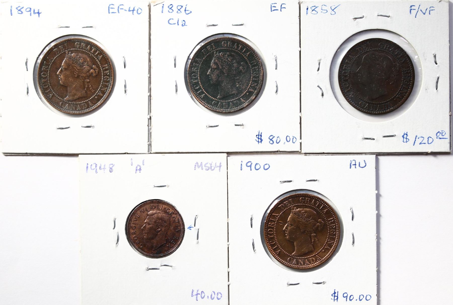 1858-1948 1¢ Lot of 5 coins Good to AU.