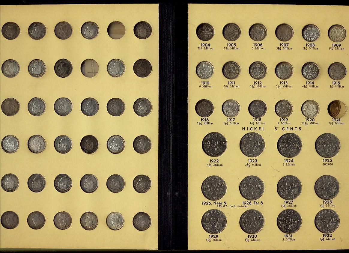 1858 - 1976 5¢ Collection. Collection housed in old Library of Coins (Volume 61) Blue book. Set includes 113 pcs. 1921 5¢ not included. Coins grade VG to AU, VF as an average. Includes two certified examples, 1858 Lg Date ICCS VF20 and the 1875H Lg Date ICCS VG10. A wonderful set that should be viewed. No damaged or problem coins.