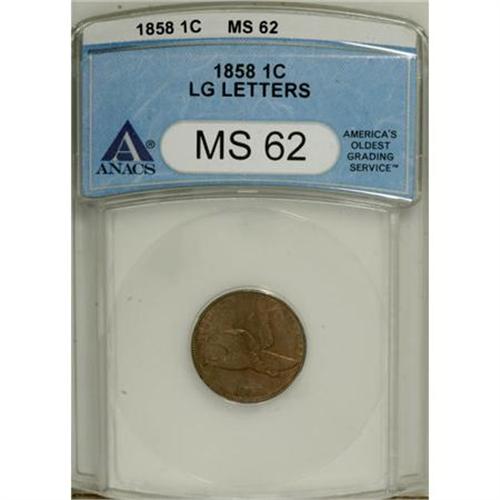 <B>1858 1C Large Letters MS62 ANACS.</B></I> NGC Census: (86/623). PCGS Population (154/985). Mintage: 24,600,000. Numismedia Wsl. Price for NGC/PCGS coin in MS62: $380. (#2019)<BR><BR><B>Coin Engraver:</B> James B. Longacre<BR><BR><b>Shipping:</b> Coins & Currency (<a target="_blank" href="http://www.heritageauctions.com/common/shipping.php">view shipping information</a>)