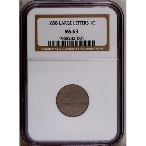 <B>1858 1C Large Letters MS63 NGC.</B></I> High leaves, closed E. Scattered mint red still peeks around the legends and devices. The strike is fairly bold, with slight softness on some of the wreath details. There a few light flyspecks on the reverse, visible only under magnification.