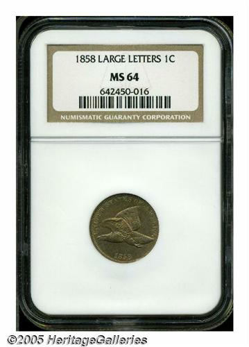<B>1858<1C> Large Letters MS64 NGC.</B></I> Attractive sand-color surfaces with good luster and a few minor planchet laminations, as struck, including one to the left of the eagle's forward wing.