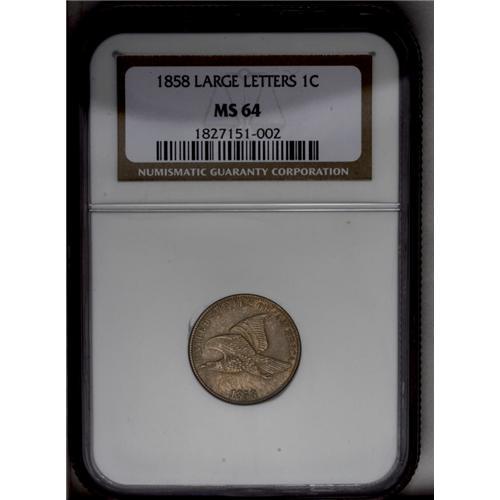 <B>1858<1C> Large Letters MS64 NGC.</B></I> Low Leaves, Closed E. This golden-brown near-Gem is sharply struck and has vivacious luster. The left obverse field has a few trivial marks. A die break occupies much of the right reverse rim.