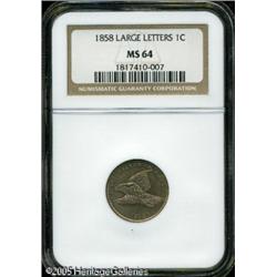 <B>1858 1C Large Letters MS64 NGC.</B></I> Softly struck on the eagle's head and neck, with bright satiny luster, pleasant golden-tan color, and noticeable die clash marks (as struck) on the upper obverse. Virtually blemish-free on obverse and reverse alike. Lot:5180
