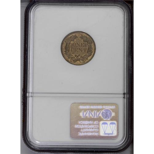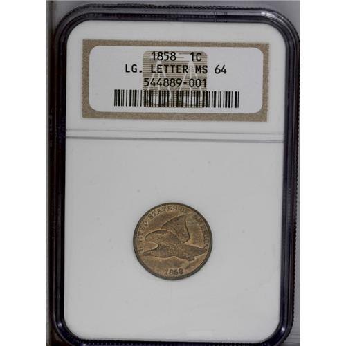 <B>1858<1C> Large Letters MS64 NGC.</B></I> High Leaves Reverse. The lustrous surfaces show a moderate overlay of brown patina that partially subdues the brightness and "whiteness" of the copper-nickel alloy. Better struck than most 1857 cents, this 1858 lacks just a bit of highpoint definition on the venation of the leaves and eagle's breast. Minimally abraded and quite attractive for this widely collected, short-lived type.<BR><I>From The Tigard Oregon Small Cent Collection.</B></I>