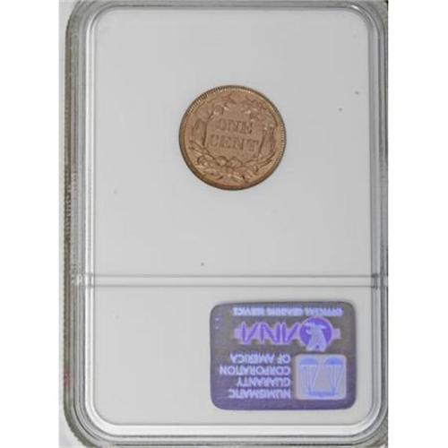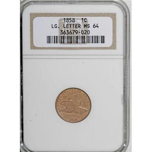 <B>1858 1C Large Letters MS64 NGC.</B></I> High Leaves, Closed E in ONE. Well struck and much more lustrous than average, for the type, with pleasing chestnut and reddish-gold toning, and carefully preserved surfaces. Just a few tiny chatter marks and scattered flyspecks are noted on each side of this attractive near-Gem. <BR><BR><B>Coin Engraver:</B> James B. Longacre<BR><BR><b>Shipping:</b> Coins & Currency (<a target="_blank" href="http://www.heritageauctions.com/common/shipping.php">view shipping information</a>\)