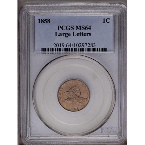 <B>1858<1C> Large Letters MS64 PCGS.</B></I> High Leaves, Closed E in ONE. A pleasing reddish-tan near-Gem with nice luster. The surfaces seem near-pristine on both sides. Only obverse peripheral striking softness and weakness on parts of the wreath prevent a higher grade designation.