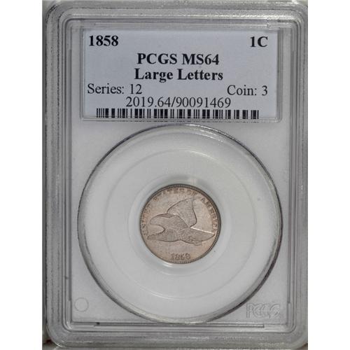 <B>1858 1C Large Letters MS64 PCGS.</B></I> High Leaves, Closed E in ONE. This semi-prooflike near-Gem has minor striking weakness on the tailfeathers and wingtips, but the surfaces have surprisingly few marks for the grade. The obverse has minor planchet flaws (as made) at 8 and 11 o'clock.<BR><BR><b>Shipping:</b> Coin/Currency (<a target="_blank" href="http://www.heritageauctions.com/common/shipping.php">view shipping information</a>)