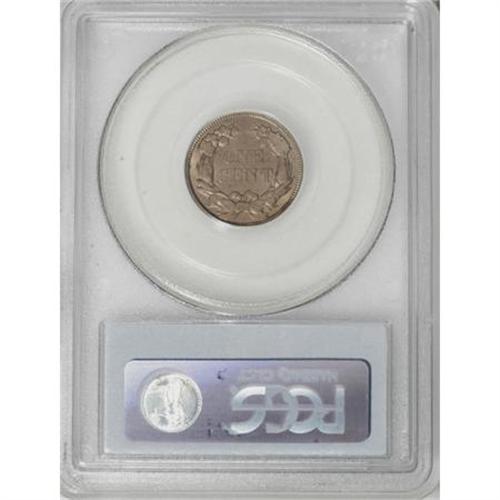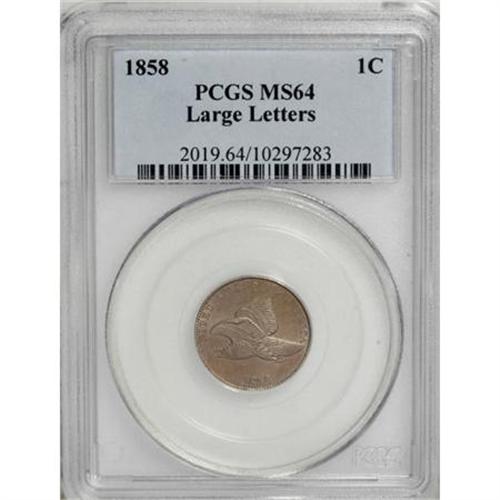 <B>1858 1C Large Letters MS64 PCGS.</B></I> High Leaves, Closed E in ONE. A pleasing reddish-tan near-Gem with nice luster. The surfaces are nearly immaculate, and only peripheral indifference of strike prevents a higher grade.<BR><I>From The Madison Collection.</B></I><BR><BR><B>Coin Engraver:</B> James B. Longacre<BR><BR><b>Shipping:</b> Coins & Currency (<a target="_blank" href="http://www.heritageauctions.com/common/shipping.php">view shipping information</a>)