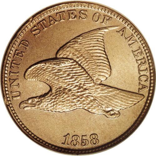 <B>1858 1C Large Letters MS65 NGC.</B></I> High Leaves, closed E. A bold striking in virtually all areas, with scintillating luster that complements the silver-tan surfaces. Flying Eagle cents are a short-lived and highly collectible series usually collected as a precursor to the Indian cent series and are quite rare and valuable in higher grades. Census: 138 in 65, 22 finer (1/06).