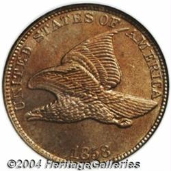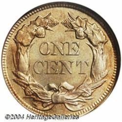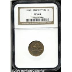 <B>1858<1C> Large Letters MS65 NGC.</B></I> An especially bold strike with swirling amber and steel-violet overtones, being somewhat more deeply toned on the reverse. A small fleck in the upper right obverse field does not detract. <BR><BR><B>Important notice:</B> Heritage usually auctions material at the rate of 200-250 lots per hour. On some occasions eBay Live bid software or the Internet may not be able to keep up with the pace of the auction. We recommend placing a realistic absentee bid now as insurance to avoid disappointment. Occasionally the auctioneer may eliminate or reject an eBay Live bid, and the auctioneer may also reopen a lot after the close of the eBay live bidding (usually because we missed an audience bid), and may reject your bid even if it shows you as the winning bidder. By bidding via eBay Live, you agree that Heritage may award the lot to another bidder at its sole discretion under the circumstances described above or any other reasonable circumstances. Since eBay bids are not shown to us until we open the lot on the floor, we treat those bids just like floor bids. In most cases the floor responds before the eBay bid is presented to us, due to Internet lag time, so for consistency we have made it a policy that floor bids are always considered first over tie eBay live bids. Also please note that all Heritage lots purchased through eBay Live carry a 20% Buyer's Premium. Please make sure you read the Terms and Conditions before you bid. </span></font></tr></table></td></tr></table>