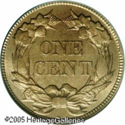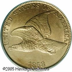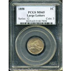 <B>1858 1C Large Letters MS65 PCGS.</B></I> Easily identifiable as a Large Letters variety by the A and M in AMERICA joined together at the bottom of the letters. This lovely Gem is well struck throughout and shows a light intermingling of steel-tan coloration scattered over each side. The reverse is a bit deeper in hue than the obverse. Lot:5182