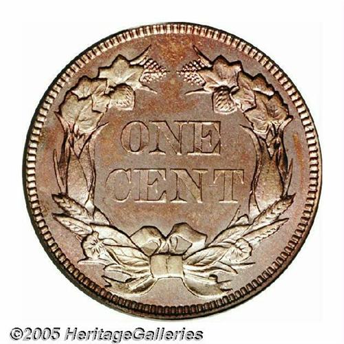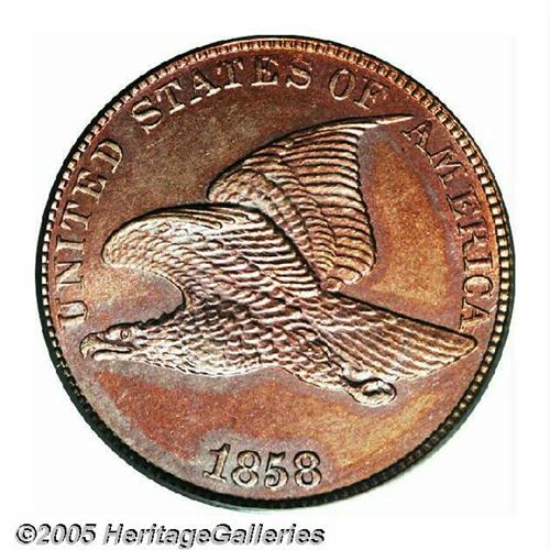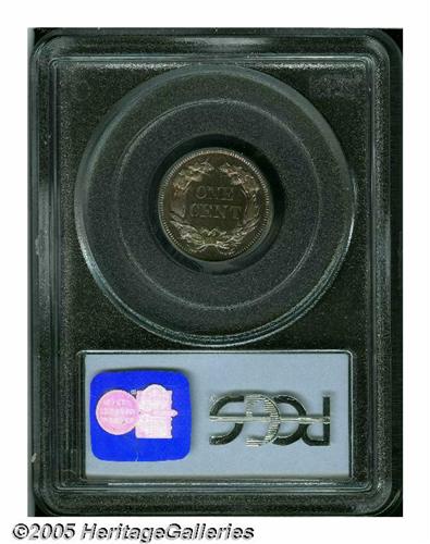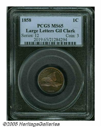 <B>1858<1C> Large Letters MS65 PCGS.</B></I> Ex: Gil Clark. A bold striking in virtually all areas, with scintillating luster that complements the orange-gold, powder-blue, and lilac surfaces. Endless die striations run diagonally across the reverse, and there a few minutely discolored areas along the border. Flying Eagle cents are a short-lived and highly collectible series usually collected as a precursor to the Indian Cent series and are quite rare and valuable in higher grades. Population: 139 in 65, 25 finer (6/05).<BR><I>From The Melrose Bay Collection.</B></I>