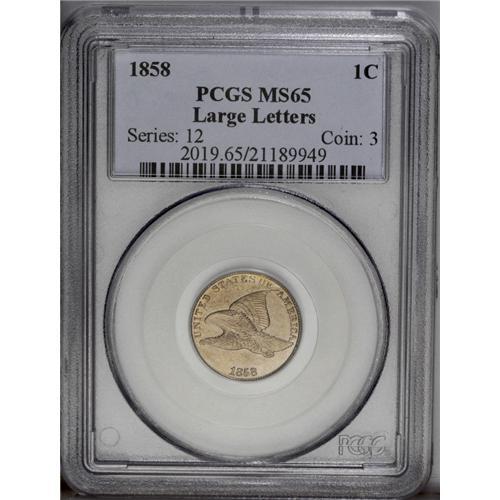<B>1858<1C> Large Letters MS65 PCGS.</B></I> High Leaves Reverse, Closed E in ONE. This gorgeous khaki-gold Gem exhibits vibrant cartwheel sheen, and both contact and carbon are minimal. Well struck save for unimportant softness on OF and the right ribbon end. 1858 was the last stand for the Flying Eagle cent, which was produced for circulation for only two years.