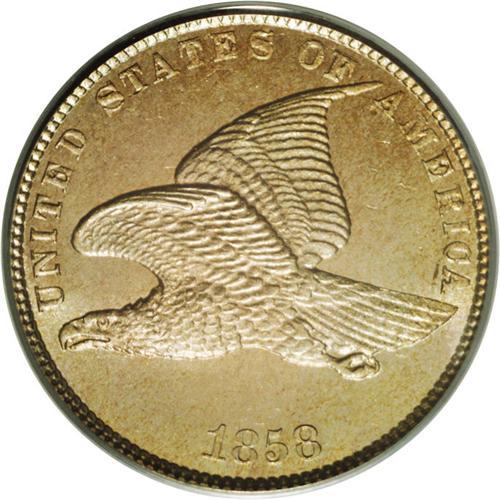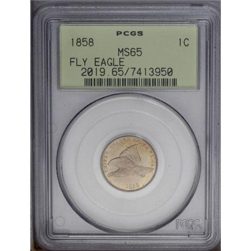 <B>1858<1C> Large Letters MS65 PCGS.</B></I> Low Leaves, Closed E. The major design elements are boldly struck and vibrant luster emanates from golden and pale lilac surfaces. Some of the obverse lettering is a trifle soft and abrasions are concentrated in the field below AMERICA. <BR><BR><B>Important notice:</B> Heritage usually auctions material at the rate of 200-250 lots per hour. On some occasions eBay Live bid software or the Internet may not be able to keep up with the pace of the auction. We recommend placing a realistic absentee bid now as insurance to avoid disappointment. Occasionally the auctioneer may eliminate or reject an eBay Live bid, and the auctioneer may also reopen a lot after the close of the eBay live bidding (usually because we missed an audience bid), and may reject your bid even if it shows you as the winning bidder. By bidding via eBay Live, you agree that Heritage may award the lot to another bidder at its sole discretion under the circumstances described above or any other reasonable circumstances. Since eBay bids are not shown to us until we open the lot on the floor, we treat those bids just like floor bids. In most cases the floor responds before the eBay bid is presented to us, due to Internet lag time, so for consistency we have made it a policy that floor bids are always considered first over tie eBay live bids. Also please note that all Heritage lots purchased through eBay Live carry a 20% Buyer's Premium. Please make sure you read the Terms and Conditions before you bid. This lot is being auctioned in conjunction with a live floor auction by Heritage Galleries & Auctioneers. All final auction and invoice information will be supplied by Heritage Galleries & Auctioneers, and all other information should be considered preliminary. Lot:360 <BR><BR><B>Winning Notification and Billing:</B> After the FINAL session in this auction is complete, Heritage will send e-mail and snail mail invoices. This process normally takes several days. All final auction and invoice information will be supplied by Heritage Galleries & Auctioneers, and all other information should be considered preliminary. <BR><BR>This auction will be conducted on a live auction floor and over the Internet through eBay Live. If you choose to place an absentee bid, please take a moment to <font color='#0000ff'><u><a href='http://pages.ebay.com/liveauctions/help/before/laabsentee.html'>learn how eBay Live absentee bidding works</a></u></font><font color='#000000'>