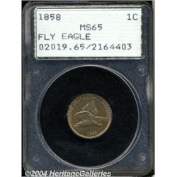 <B>1858<1C> Large Letters MS65 PCGS.</B></I> Pleasing light golden-tan color visits each side of this highly attractive Flying Eagle cent. The lustrous and smooth surfaces are nearly blemish free, exhibiting just a tiny, obscure mark or two on each side. Exquisitely struck design elements further enhance the eye appeal of this marvelous specimen. Housed in a first generation PCGS holder. <BR><BR><B>Important notice:</B> Heritage usually auctions material at the rate of 200-250 lots per hour. On some occasions eBay Live bid software or the Internet may not be able to keep up with the pace of the auction. We recommend placing a realistic absentee bid now as insurance to avoid disappointment. Occasionally the auctioneer may eliminate or reject an eBay Live bid, and the auctioneer may also reopen a lot after the close of the eBay live bidding (usually because we missed an audience bid), and may reject your bid even if it shows you as the winning bidder. By bidding via eBay Live, you agree that Heritage may award the lot to another bidder at its sole discretion under the circumstances described above or any other reasonable circumstances. Since eBay bids are not shown to us until we open the lot on the floor, we treat those bids just like floor bids. In most cases the floor responds before the eBay bid is presented to us, due to Internet lag time, so for consistency we have made it a policy that floor bids are always considered first over tie eBay live bids. Also please note that all Heritage lots purchased through eBay Live carry a 20% Buyer's Premium. Please make sure you read the Terms and Conditions before you bid. </span></font></tr></table></td></tr></table>