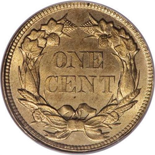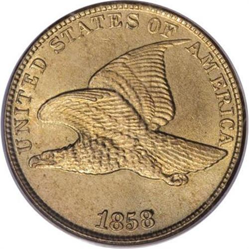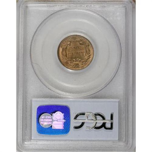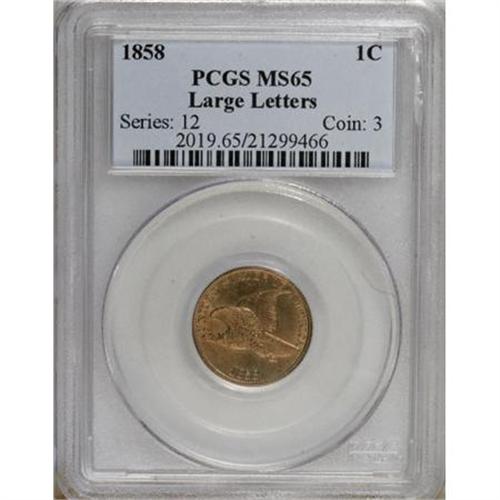 <B>1858 1C Large Letters MS65 PCGS.</B></I> High Leaves Reverse. Closed E in ONE. The Large and Small Letters obverse have long been recognized by collectors and have been listed in the Red Book since the first edition. Gem examples are scarce. This is a lovely example that has lustrous, pale honey-tan surfaces. Sharp but not fully struck, close magnification reveals a couple of tiny specks of carbon on each side, but there are no obvious or mentionable abrasions.<BR><BR><b>Shipping:</b> Coins & Currency (<a target="_blank" href="http://www.heritageauctions.com/common/shipping.php">view shipping information</a>)