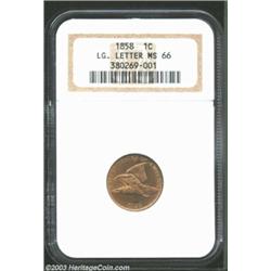 1858 1C Large Letters MS66 NGC. A stellar representative of this short-lived, yet attractive type, both sides are predominantly orange-tan in appearance. Some speckles of variegated hues are seen mostly in the center of the reverse, but not even close inspection reveals any bothersome abrasions. Sharply struck with a mentionable planchet void (as produced) on the obverse at the final S in STATES. Population: 17 in 66, there is only one example finer (2/03). Important notice: We expect to be auctioning lots at the rate of 200-250 per hour. On occasion eBay live bid software cannot keep up with the pace of the auctions where 4-5 lots per minute can hammer down, so we recommend that you place a realistic absentee bid now as insurance to avoid disappointment. Also please note that all Heritage/CAA lots purchased through eBay Live carry a 20% Buyer's Premium. Please make sure you read the Terms and Conditions.