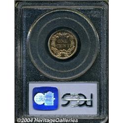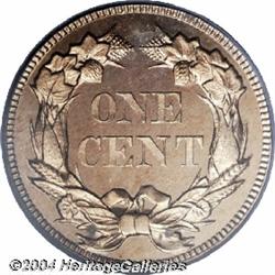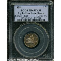 <B>1858<1C> Large Letters PR65 Cameo PCGS.</B></I> Ex: Palm Beach Collection. Snow-PR1. An unmistakable proof striking just from the overall appearance of the coin and depth of mirrored reflectivity in the fields. However, this piece also shows all the diagnostics listed for proof strikings, including the doubled die obverse, high leaves reverse, and the diagonal file marks below the first 8 and the 5 in the date. It has been reported that 100 proofs were struck of the Large Letters variant. This number is derived from the 80 silver proof sets the Mint sold plus a small number (perhaps 20) of 1858 pattern sets. The number of survivors seems to confirm this estimate, and it is believed that today around 50 proof Large Letters are extant in all grades. As mentioned, the fields are deeply mirrored with a light accent of reddish patina on each side. The devices are nicely frosted and present a noticeable contrast against the reflectivity on each side. Identifiable for pedigree purposes by a couple of spots at the top of the reverse. Population: 3 in 65, 0 finer (9/04). <BR><BR><B>Important notice:</B> Heritage usually auctions material at the rate of 200-250 lots per hour. On some occasions eBay Live bid software or the Internet may not be able to keep up with the pace of the auction. We recommend placing a realistic absentee bid now as insurance to avoid disappointment. Occasionally the auctioneer may eliminate or reject an eBay Live bid, and the auctioneer may also reopen a lot after the close of the eBay live bidding (usually because we missed an audience bid), and may reject your bid even if it shows you as the winning bidder. By bidding via eBay Live, you agree that Heritage may award the lot to another bidder at its sole discretion under the circumstances described above or any other reasonable circumstances. Since eBay bids are not shown to us until we open the lot on the floor, we treat those bids just like floor bids. In most cases the floor responds before the eBay bid is presented to us, due to Internet lag time, so for consistency we have made it a policy that floor bids are always considered first over tie eBay live bids. Also please note that all Heritage lots purchased through eBay Live carry a 20% Buyer's Premium. Please make sure you read the Terms and Conditions before you bid.
