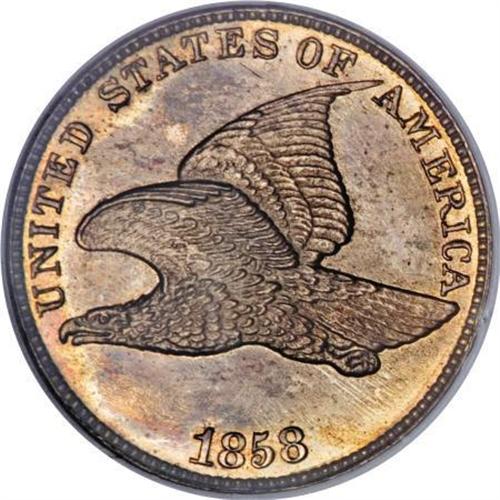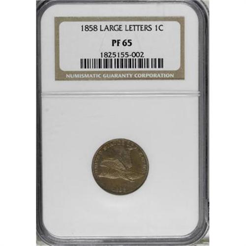 <B>1858 1C Large Letters PR65 NGC.</B></I> While the famous 1856 Flying Eagle cent always sells for princely sums, when it comes to proof strikings its Large Letters counterpart of 1858 is the true king of this short-lived series. Out of an estimated mintage of only 80-100 pieces, only few dozen specimens have survived at all levels of preservation. In addition to the expected strength of detail and reflective surfaces, proofs can be distinguished by diagonal file marks in the denticles below the first 8 and the 5 in the date, and a minute die file mark near the reverse rim close to 12 o'clock. This elusive Gem displays pinpoint sharpness with milky lilac patina that gives way to glimpses of golden-orange color at the margins. A straight lintmark below ES in STATES was on the dies at the time of striking and is likely unique to this example. Census: 9 in 65, 2 finer (12/07).<BR><BR><B>Coin Engraver:</B> James B. Longacre<BR><BR><b>Shipping:</b> Coins & Currency (<a target="_blank" href="http://www.heritageauctions.com/common/shipping.php">view shipping information</a>)