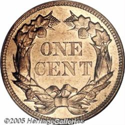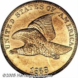 <B>1858 1C PR65 Cameo NGC.</B></I> Snow-PR1. The number of examples originally coined, as well as the number of survivors today, are not known with accuracy. Richard Snow estimated a mintage of 80 examples of this Large Letters variety as well as an additional 100 Small Letters proofs. In <I>A Buyer's and Enthusiast's Guide to Flying Eagle and Indian Cents,</B></I> Dave Bowers suggested that between 50 and 100 of these Large Letters proof Cents were distributed, and that they may have been included as part of the pattern copper-nickel Cent sets issued that year. Bowers further opined that the Small Letters proofs were distributed not only in 1858, but as restrikes produced during the next few years. According to Bowers, the Large Letters proofs are extremely rare, and are much rarer than their Small Letters brethren.<BR> All of the specific die characteristics described by Snow for his first listed variety of proof 1858 cents are present on this specimen, including the short diagonal die file marks from the dentils below the first 8 and the 5. Deeply mirrored with rich golden-tan surfaces and frosty devices. Very sharply struck as expected for these proof coins. Minor lint marks in the fields, as well as slight doubling among various letters on both sides, confirm the status of this proof example. The mirrored fields crisply intersect with the devices, unlike some prooflike circulation strikes that exhibit slight mint frost at these junctures. This is an example of exceptional beauty and will certainly be a prized possession of the new owner.