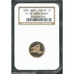 <TR><TD width="100%"><TABLE cellSpacing=1 cellPadding=3 width="100%" border=0><TBODY><TR><TD width="100%" bgColor=#79735c><FONT face=arial color=#ffffff size=3><B>Description</B> </FONT></TD></TR><TR><TD width="100%" bgColor=#ffffff><FONT face=arial size=2><B>1858 1C PR67 Deep Cameo NGC.</B></I> Occasionally prooflike Flying Eagle cents are confused with the very rare proof strikings, but in this case there can be no confusion. The diagnostics for genuine proofs are listed in Snow's book that covers this series. They include: diagonal die file marks in the denticles below the first 8 and the 5 in the date. The date also slants up to the right. Minor doubling is also seen on UNI in UNITED. On the reverse, a minute die file mark is located in the denticles just left of 12 o'clock. These die markers are all very small and strong magnification is required to pick them out. However, they are present, and this die was not used on any business strikes.<BR>As with all genuine proof Flying Eagle cents, the fields are deeply mirrored and the striking definition is razor sharp. This coin is truly a wonder to behold. The fields show unfathomable depth of reflectivity and the devices are nicely frosted, which yields an unmistakable two-toned cameo effect. The surfaces are hairline-free and we cannot locate any specks of carbon. There are a few tiny planchet voids on each side, probably lint marks from when the dies were wiped prior to striking. The only one that might be large enough to use as a pedigree identifier in the future is located just above the bottom of the E in ONE on the reverse.<BR>Only 100 Large Letter proofs are estimated to have been struck. This number is based upon a known production of 80 silver proof sets plus a small number of pattern sets, probably no more than 20 pieces. Snow believes no more than 50 examples survive today in all grades, a number that would make an original mintage of 100 pieces seem like a reasonable estimate. This is the finest example certified by either of the two major services, and it is essentially an unimprovable coin. The pristine surfaces retain a generous amount of original whitish color from the copper-nickel alloy with the addition of a light overlay of pale reddish patina on each side. </FONT></TD></TR></TBODY></TABLE></TD></TR></TBODY></TABLE><BR><A name=PricesRealized></A><TABLE cellSpacing=0 cellPadding=0 width="100%" bgColor=#000000 border=0><TBODY><TR><TD width="100%"><TABLE cellSpacing=1 cellPadding=3 width="100%" border=0><TBODY><TR><TD width="100%" bgColor=#79735c><A name=PR><FONT face=arial color=#ffffff size=3><B>Previous Prices from Heritage Auctions</B> </FONT></A></TD></TR><TR><TD bgColor=#f6f6ed>No Prior Data Recorded </TD></TR><TR><TD bgColor=#ffffff><FONT face=arial size=1 ?>PLEASE NOTE: All prices realized reflect the final hammer price PLUS the buyer's premium in auctions that charge a buyer's premium. Each item has a notation at the top of the listing indicating whether that lot included a buyer's premium. Example: A item that sells with a final hammer price of $100 and a 20% buyer's premium will display with a price realized of $120. All information listed is intended to be as accurate as possible, but errors are possible. Please use this guide carefully and inform us of any inaccuracies. </FONT></TD></TR></TBODY></TABLE></TD></TR></TBODY></TABLE><BR><TABLE cellSpacing=0 cellPadding=0 width="100%" bgColor=#000000 border=0><TBODY><TR><TD width="100%"><TABLE cellSpacing=1 cellPadding=3 width="100%" border=0><TBODY><TR><TD width="100%" bgColor=#79735c colSpan=6><FONT face=arial color=#ffffff size=3><B>Price Guide*</B> </FONT></TD></TR><TR bgColor=#f6f6ed><TD align=middle><B>Grade</B> </TD><TD align=middle><B>Coin World<BR>(Trends)</B> </TD><TD align=middle><B>Numismedia<BR>Retail</B> </TD><TD align=middle><B>Numismedia<BR>Wholesale</B> </TD><TD align=middle><B>Coin<BR>Universe</B> </TD><TD align=middle><B>Heritage<BR>Value Index</B> </TD></TR><TR bgColor=#ffffff><TD align=middle>66</TD><TD align=right>---</TD><TD align=right>---</TD><TD align=right>---</TD><TD align=right>---</TD><TD align=right>---</TD></TR><TR style="FONT-WEIGHT: bold" bgColor=#cccfdd><TD align=middle>67</TD><TD align=right>---</TD><TD align=right>---</TD><TD align=right>---</TD><TD align=right>---</TD><TD align=right>---</TD></TR><TR bgColor=#ffffff><TD align=middle>68</TD><TD align=right>---</TD><TD align=right>---</TD><TD align=right>---</TD><TD align=right>---</TD><TD align=right>---</TD></TR><TR bgColor=#ffffff><TD colSpan=6><FONT size=1>*All information listed is intended to be as accurate as possible, but errors are possible. No item may be returned or refused based on this information which is provided as a service to our customers. You should contact each pricing source directly to determine the accuracy of this information. </FONT></TD></TR></TBODY></TABLE></TD></TR></TBODY></TABLE><BR><TABLE cellSpacing=0 cellPadding=0 width="100%" bgColor=#000000 border=0><TBODY><TR><TD width="100%"><TABLE cellSpacing=1 cellPadding=3 width="100%" border=0><TBODY><TR><TD width="100%" bgColor=#79735c><FONT face=arial color=#ffffff size=3><B>Population Guide</B> </FONT></TD></TR><TR bgColor=#ffffff><TD align=middle></TD></TR></TBODY></TABLE></TD></TR></TBODY></TABLE><BR><TABLE cellSpacing=0 cellPadding=0 width="100%" bgColor=#000000 border=0><TBODY><TR> Important notice: We expect to be auctioning lots at the rate of 200-250 per hour. On occasion eBay live bid software cannot keep up with the pace of the auctions where 4-5 lots per minute can hammer down, so we recommend that you place a realistic absentee bid now as insurance to avoid disappointment. Also please note that all Heritage/CAA lots purchased through eBay Live carry a 20% Buyer's Premium. Please make sure you read the Terms and Conditions.