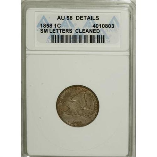 <B>1858 1C Small Letters--Cleaned--ANACS. AU58 Details.</B></I> NGC Census: (33/557). PCGS Population (40/430). Mintage: 24,600,000. Numismedia Wsl. Price for NGC/PCGS coin in AU58: $240. (#2020)<BR><BR><b>Shipping:</b> Coins & Currency (<a target="_blank" href="http://www.heritageauctions.com/common/shipping.php">view shipping information</a>)